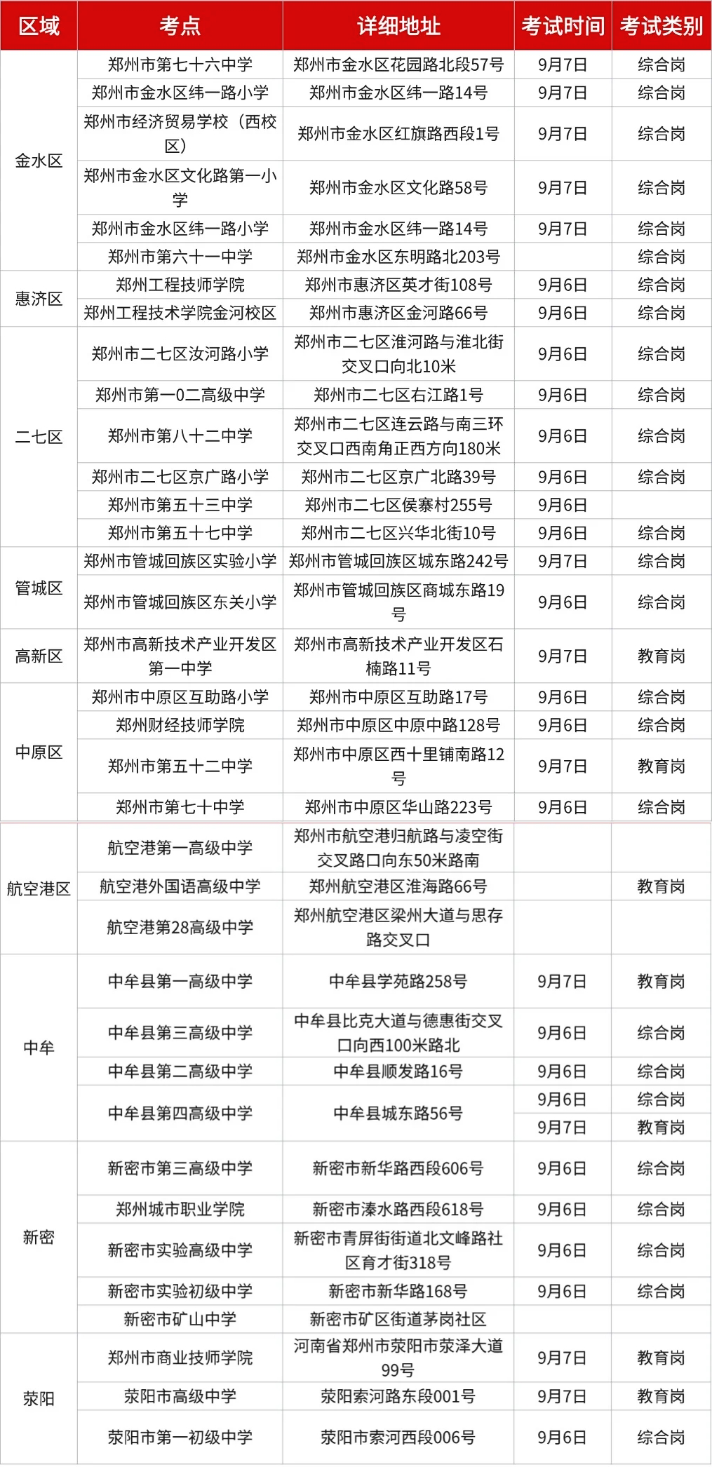 郑州市事业单位联考考场分布汇总(部分)