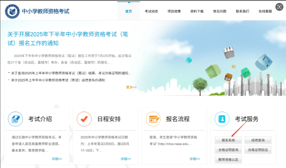 第一步:登录中小学教师资格考试网(http://ntce.neea.edu.cn/ ),考生点击右侧“考生服务”区域中的“报名系统”,进入各地报名系统。