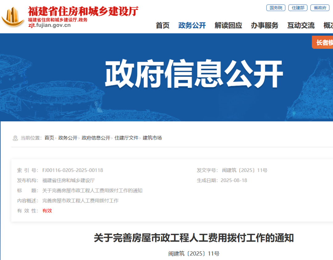 近日,福建省住建厅发布《关于完善房屋市政工程人工费用拨付工作的通知》,自2025年10月1日起施行。