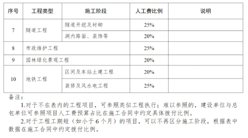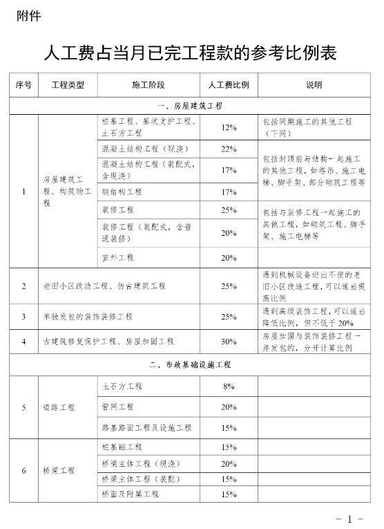 一、优化拨付比例。人工费用拨付金额,根据不同的施工阶段,按照不低于《人工费占当月已完工程款的参考比例表》(详见附件)确定的比例计算。