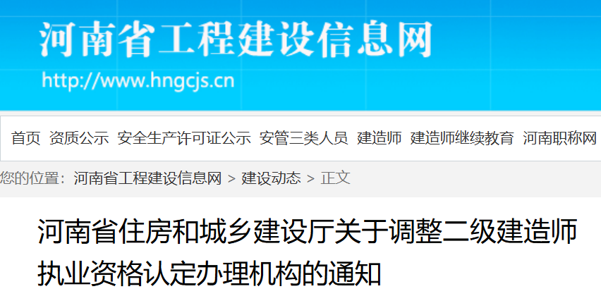 河南省工程建设信息网于近日发布《河南省住房和城乡建设厅关于调整二级建造师执业资格认定办理机构的通知》,河南省二级建造师执业资格认定自2025年4月7日起由省厅受理、办理,不再授权地方住房城乡建设主管部门受理、办理。