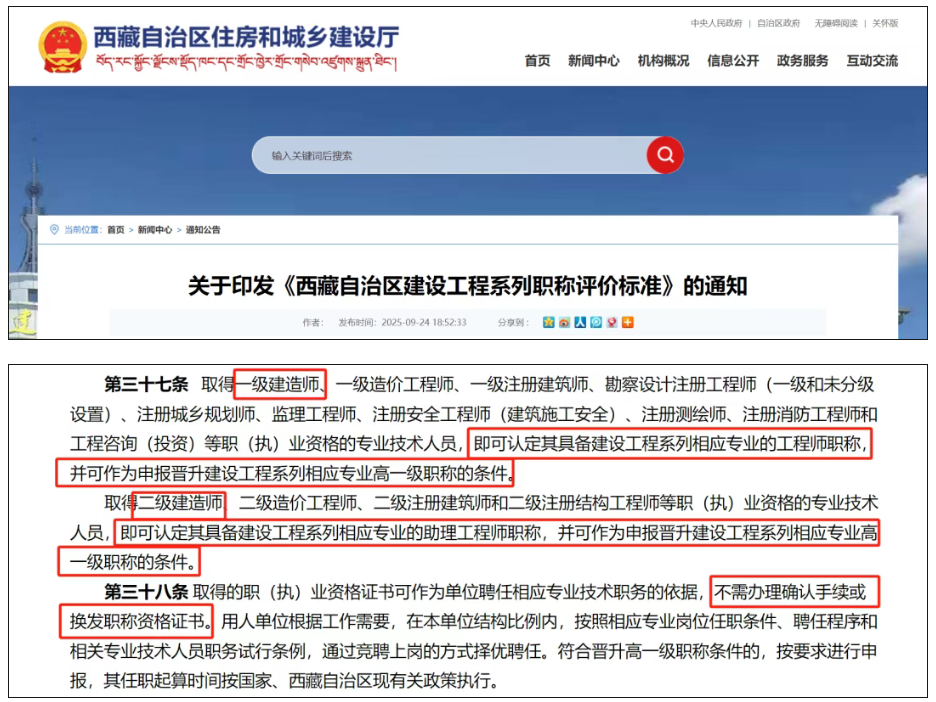 近日,关于西藏自治区住房和城乡建设厅印发《西藏自治区建设工程系列职称评价标准》的通知。其中对取得一级建造师职业资格证书后,想认定职称评价的手续又简化啦!之后无需办理职称资格确认手续或换发纸质职称证书。