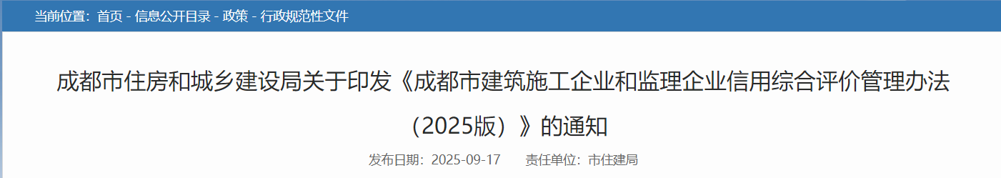 近日,成都住建局印发《成都市建筑施工企业和监理企业信用综合评价管理办法(2025版)》,10月1日起正式实施!