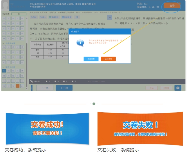 提前交卷需点击标题栏"交卷"按钮,系统会提示未作答题数量,确认后不可返回。交卷成功需看到明确提示方可离场,若显示"交卷失败"需立即联系监考人员。