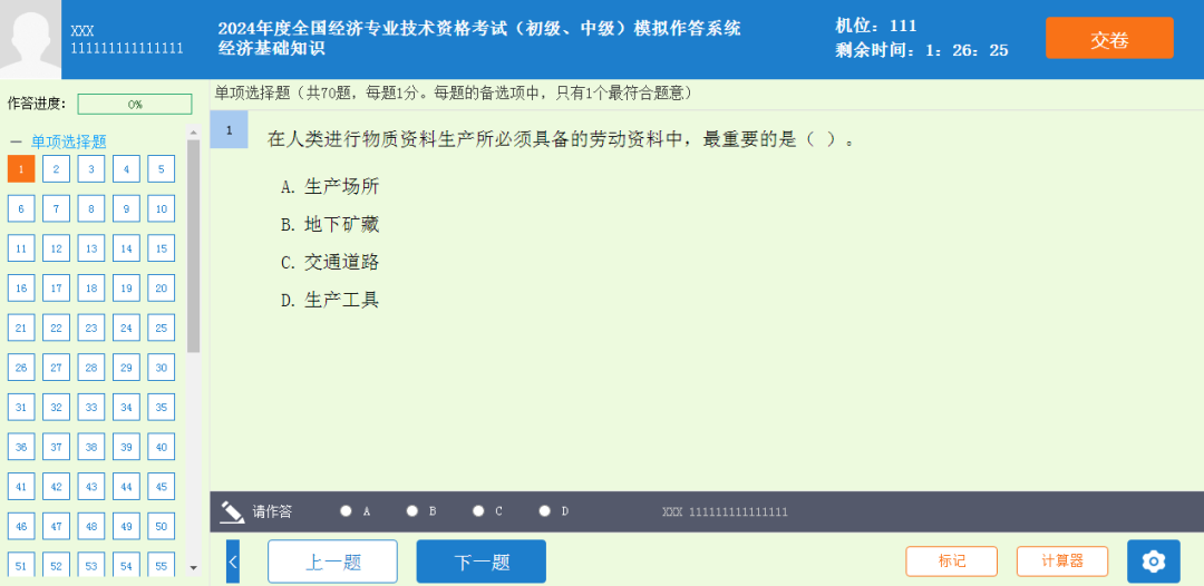 2. 题号栏:以颜色区分答题状态(白色未答、蓝色已答、橙色当前题),可标记疑难题目;
