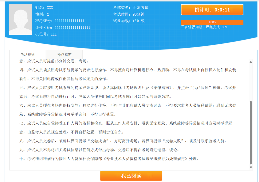 在等待界面必须点击"我已阅读"按钮,否则无法进入作答界面。考试开始后计时器将自动倒计时,建议及时点击避免浪费时间。