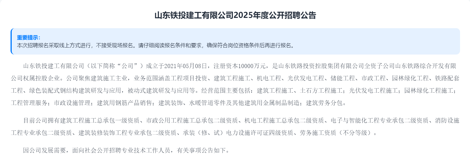 今日,山东铁投建工正式公布招聘多个岗位,持有建造师证书可报,待遇优厚,感兴趣的大家可以看看~