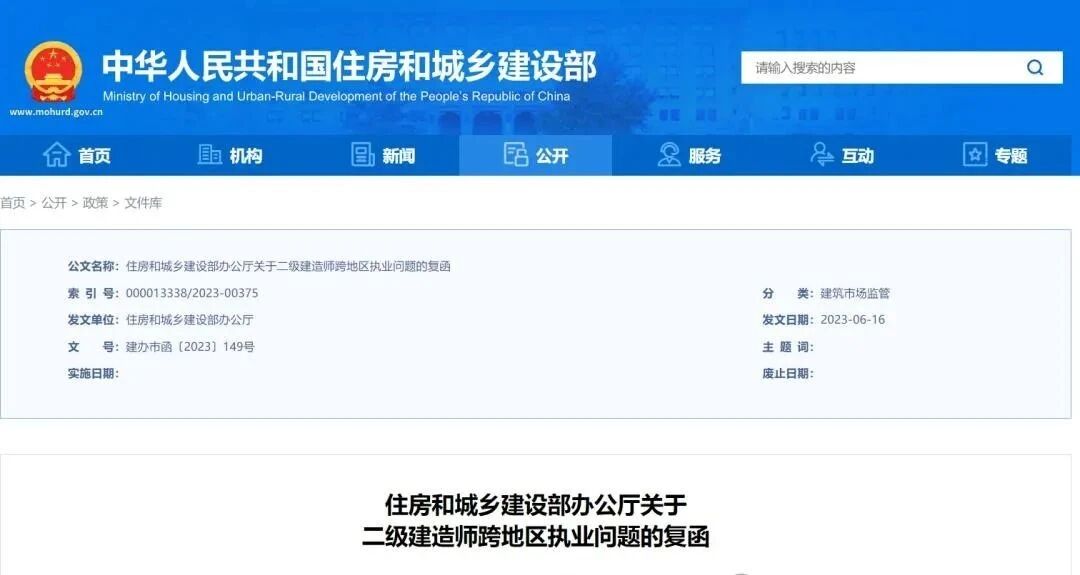 住房和城乡建设部办公厅发布关于二级建造师跨地区执业问题的复函。通知明确: