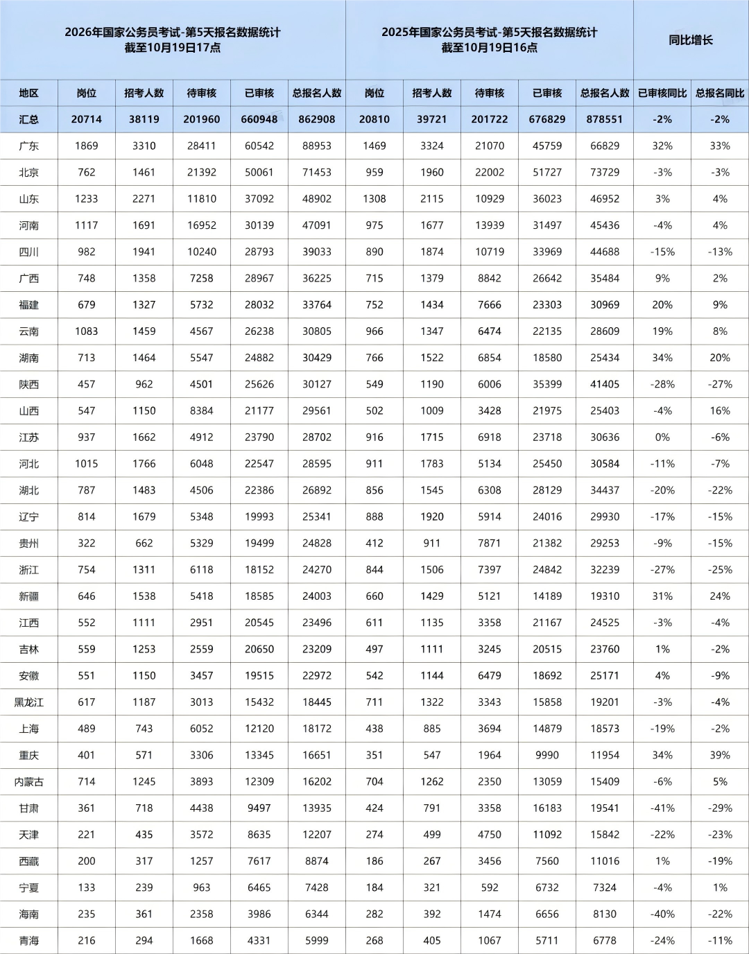截止至10月19日17时,2026年国考已报名人数达862908人,660948人过审,542个职位无人报考!一起来看看数据播报!