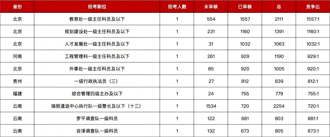 截止至10月19日17时,2026年国家公务员考试竞争比前十的岗位: