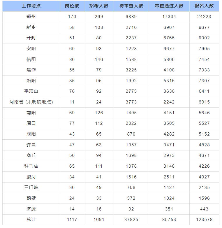 2026年度国家公务员考试报名进入第八天,河南各地市报名情况如何?【截至22日17时】报考郑州地区人数为24223人,通过审核人数为17334人,其它河南各地市报名情况详情如下: