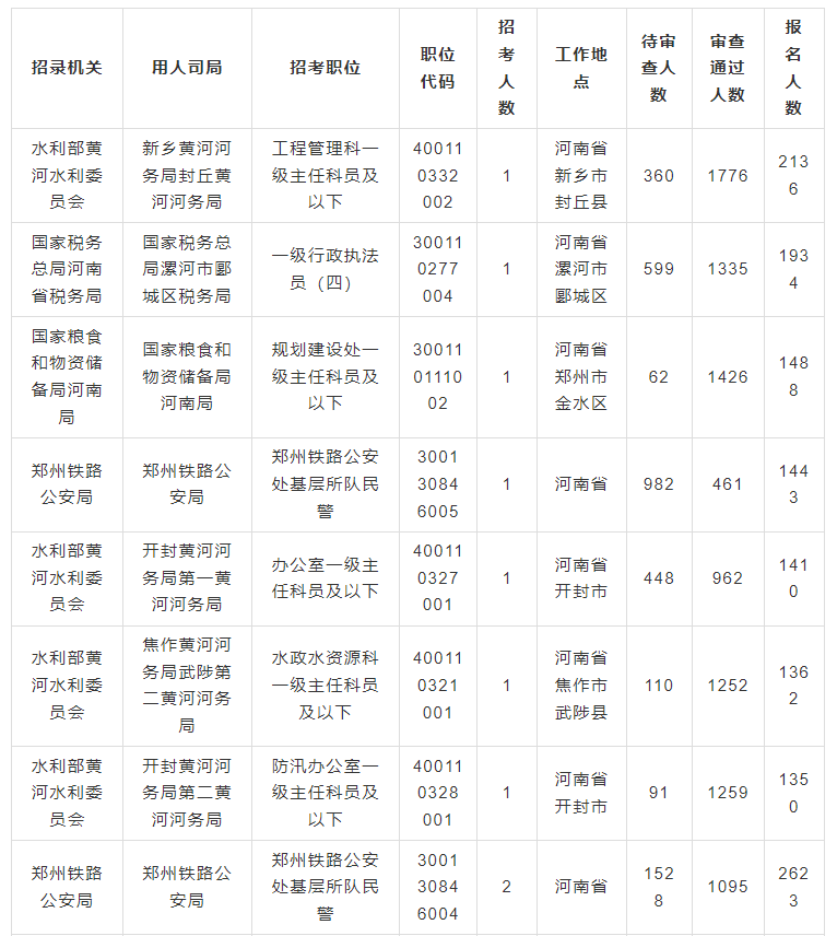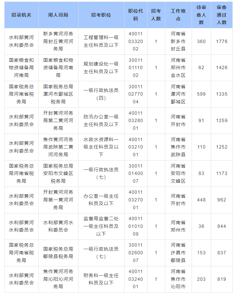 报名通过审核人数前三的(用人司局)职位,主要集中在新乡黄河河务局封丘黄河河务局-工程管理科一级主任科员及以下、国家粮食和物资储备局河南局-规划建设处一级主任科员及以下、国家税务总局漯河市郾城区税务局-一级行政执法员(四),具体信息如下: