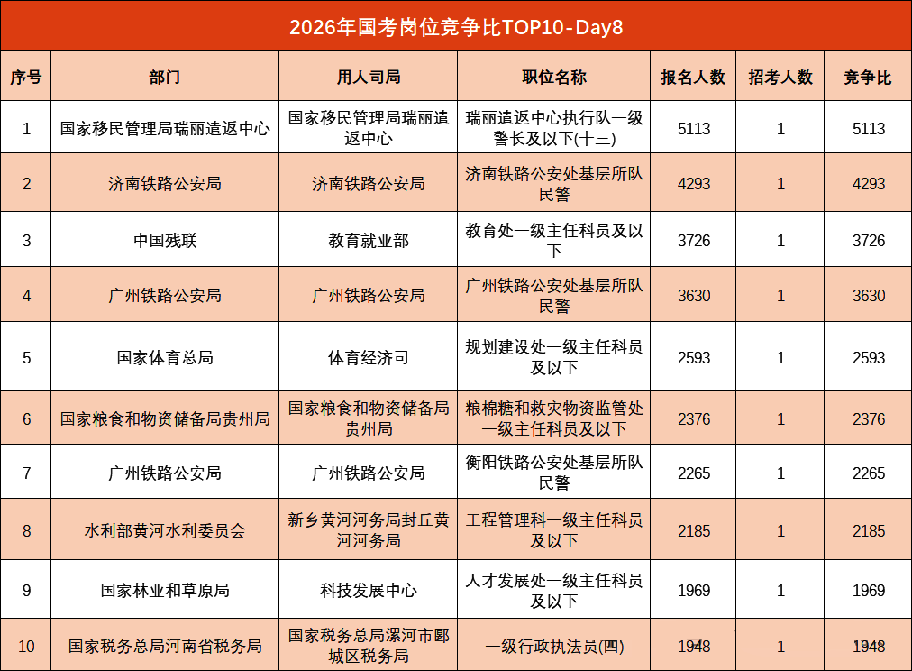 2026国考河南地区报名最激烈的前十的职位【截至22日17时】