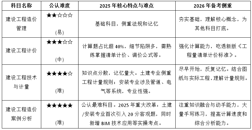 下面这个表格整理了2025年一级造价师各科目的难度、核心特点及2026年的备考侧重,可以先直观了解。