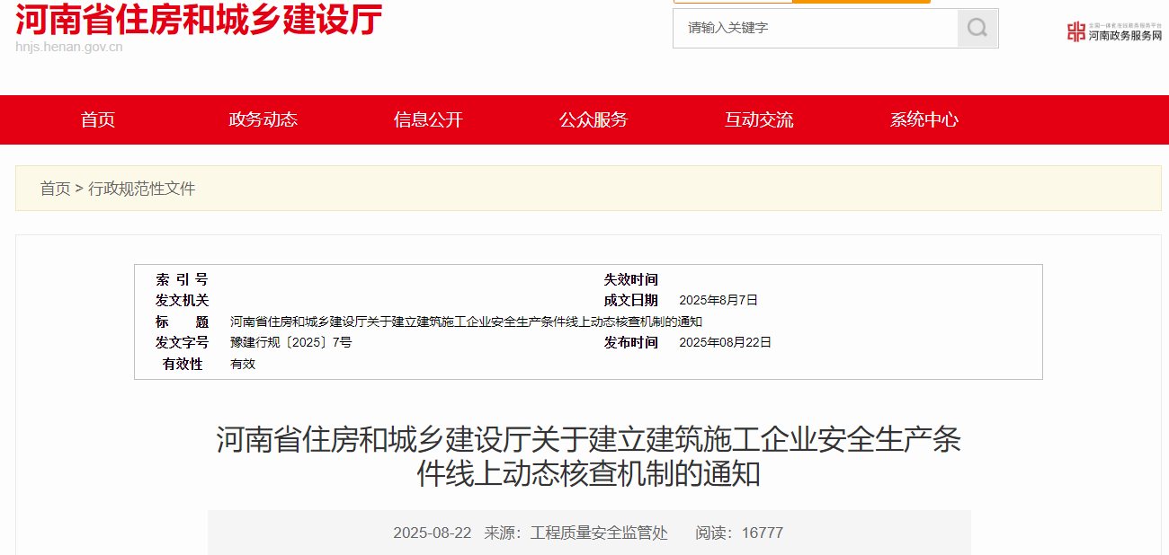 河南住建厅发布《河南省住房和城乡建设厅关于建立建筑施工企业安全生产条件线上动态核查机制的通知》。