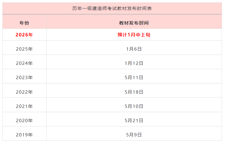 · 2025年:一级建造师教材也于1月初出版第一批,第二批在2月中旬。
