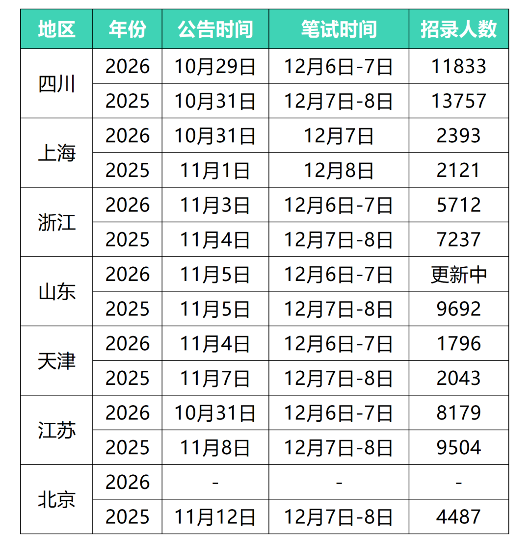结合往年的招录情况来看,2026省考首批小联考的招录人数较25年整体呈现缩招态势,暂未发布公告的北京预计将在11月发布招录公告,12月7日笔试。