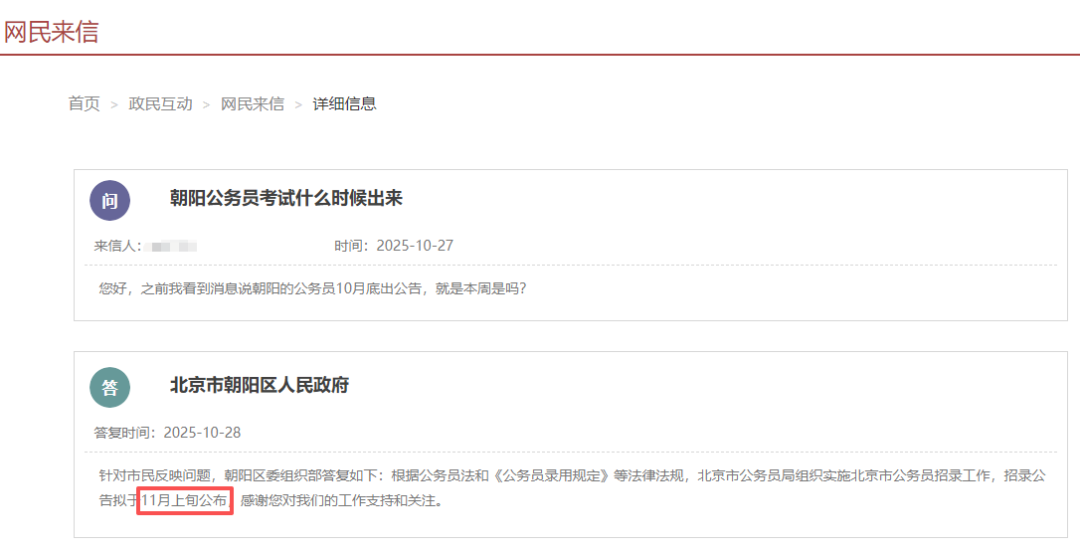 10月28日,北京市朝阳区人民政府回复网民来信时提到:北京市公务员招录工作,拟于11月上旬公布。