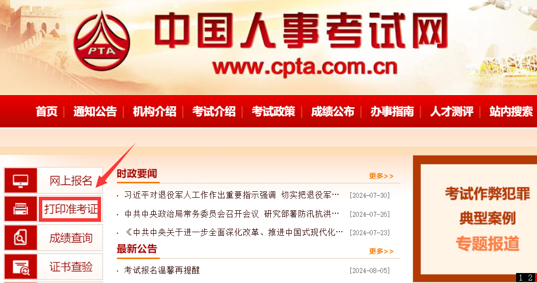 http://www.cpta.com.cn/进入中国人事考试网,点击左侧“打印准考证”按钮。