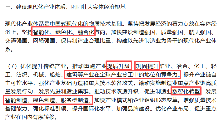 未来五年,现代化产业体系是基础,经济的着力点在实体经济上,方向是智能化、绿色化、融合化。