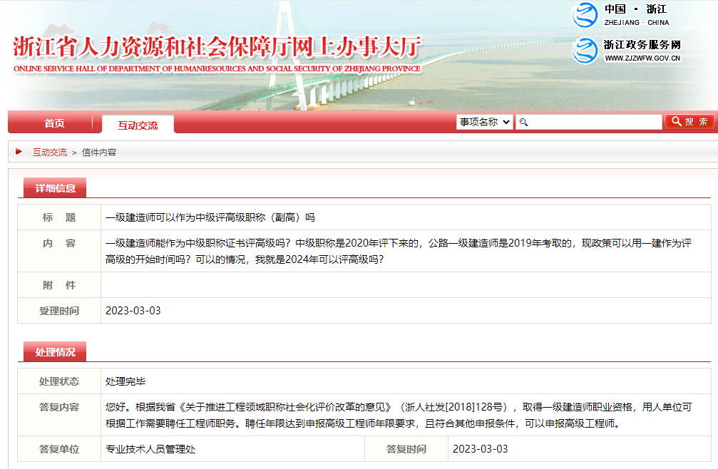 此前,有网友在浙江省人社厅咨询“一级建造师可以作为中级评高级职称(副高)吗”,官方作出回答。