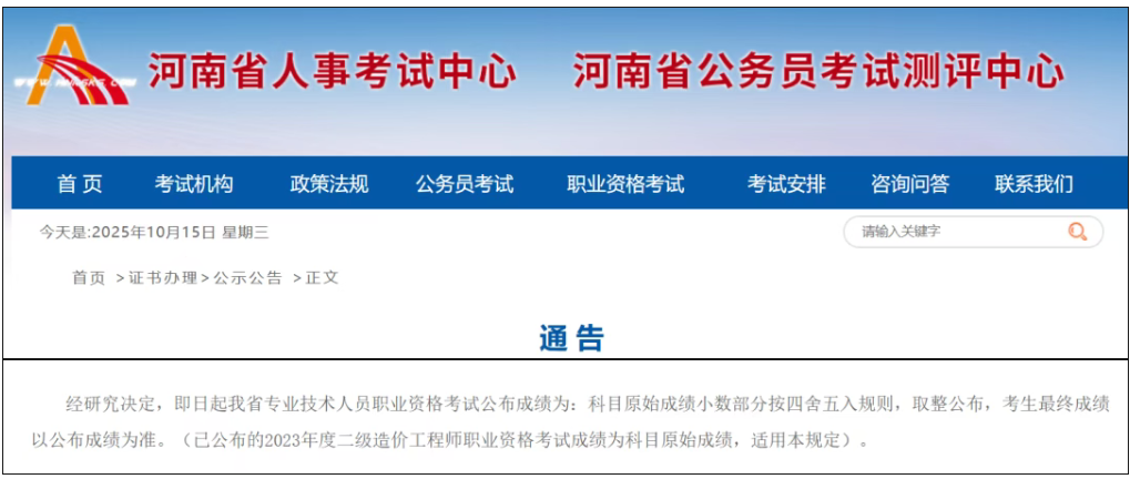 河南省人事考试中心就发了正式通知,明确专业技术人员职业资格考试的公布成绩,小数部分按四舍五入取整,考生最终成绩以公布成绩为准。