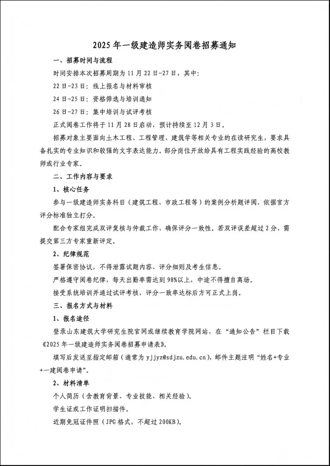 近日,网上流传出一份山东建筑大学发布的《2025年一级建造师实务阅卷招募通知》