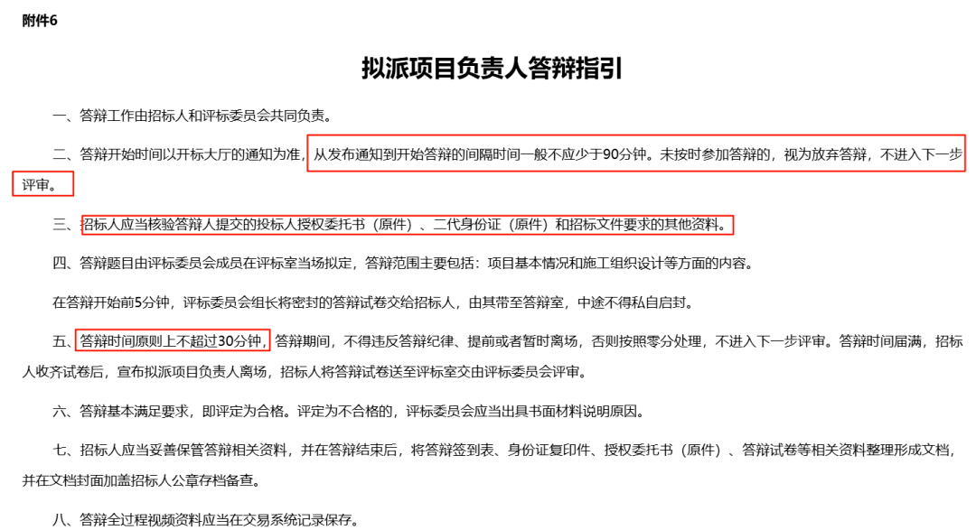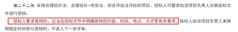 文中明确:招标人要求答辩的,应当在招标文件中明确答辩的内容、时间、地点、方式等有关事项。投标人拟派项目负责人未按照规定时间参与答辩的,不进入下一步评审。