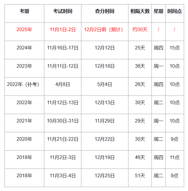 历史参考:近年成绩多在考后30天左右公布(去年是考后25天出分,因为11月27日、28日出分概率较大)