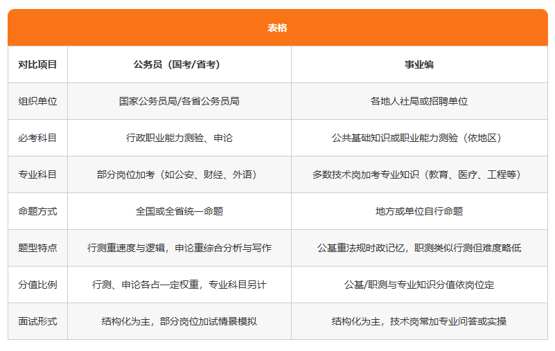 公务员国考、省考由统一考试机构命题,科目固定;事业编则由各地人社部门或招聘单位自定科目,灵活性大。常见情况下,公务员笔试必考行测与申论,部分岗位加试专业科目;事业编笔试常见公共基础知识、职业能力测验,不少岗位加考与岗位直接相关的专业知识。