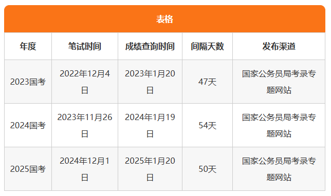 国家公务员考试由中央统一组织,笔试与成绩查询时间全国一致。参考近三年情况,可看出相对稳定的间隔规律: