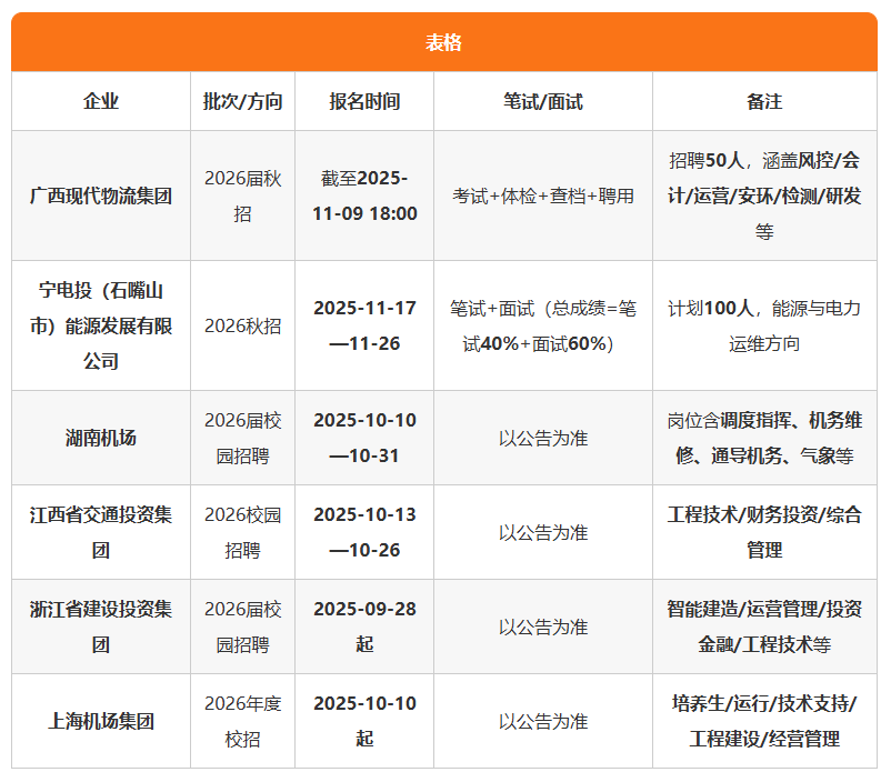 把握节点:如国家管网华南公司报名截至10-18 24:00,广西现代物流集团截至11-09 18:00,宁电投(石嘴山市)能源11-17至11-26;建议设置日历提醒,避免逾期。