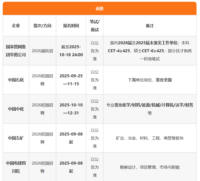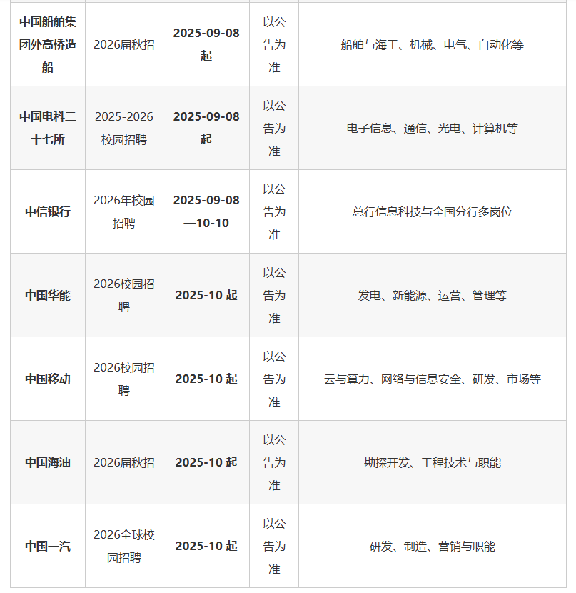 以上单位均已启动或发布2026届秋招信息,报名截止与考试安排以各单位公告为准。
