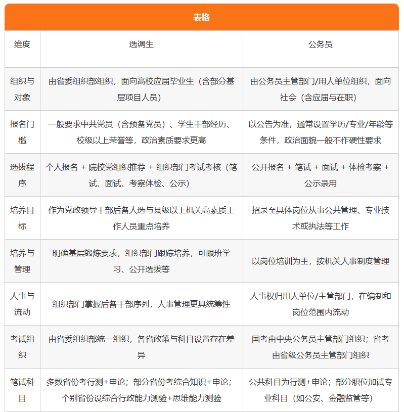 选调生与公务员同为党政机关工作人员,但选调生由省委组织部有计划从高校选拔,作为党政领导干部后备人选重点培养,录用后先到基层锻炼;普通公务员面向社会招录,以具体岗位履职为主。两者在报名门槛、选拔程序、培养管理、考试内容等方面存在系统性差异选择路径需结合自身条件与职业规划确定。