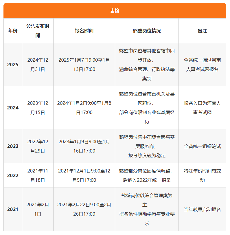 规律总结:河南省考(含鹤壁岗位)报名通常集中在1月上旬(如2025年1月7日、2024年1月2日),鹤壁岗位与其他省辖市同步开放,无单独报名通道。若2026年遵循常规节奏,报名大概率在2026年1月5日至15日之间启动,考生需以当年公告为准。