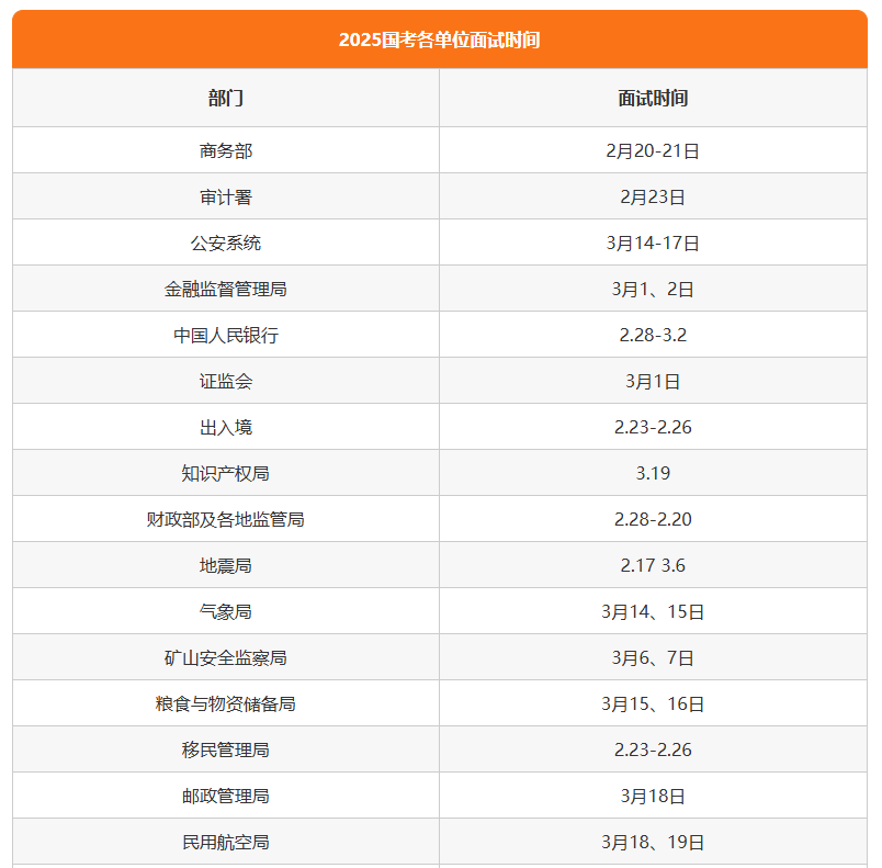 2026年国家公务员考试面试预计在2026年2月至3月进行,部分单位可能会提前至1月底开始组织面试。以下是2025年国考各部门的面试时间安排,大家可以参考一下: