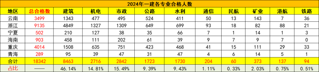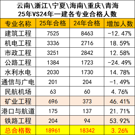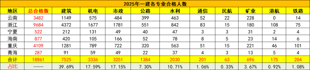 各地2025年一级建造师考试合格人数陆续公布,根据能统计到的专业合格人数,云南、浙江、宁夏、海南、重庆、青海等2025年一建考试各专业合格人数统计如下。