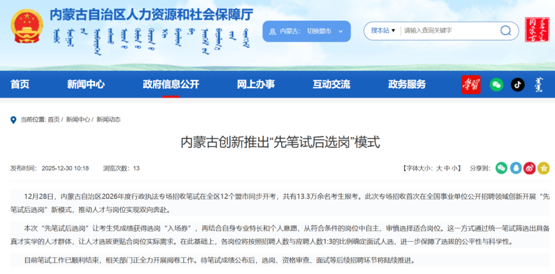 12月28日,内蒙古自治区2026年度行政执法专场招收笔试在全区12个盟市同步开考,共有13.3万余名考生报考。此次专场招收首次在全国事业单位公开招聘领域创新开展“先笔试后选岗”新模式,推动人才与岗位实现双向奔赴。
