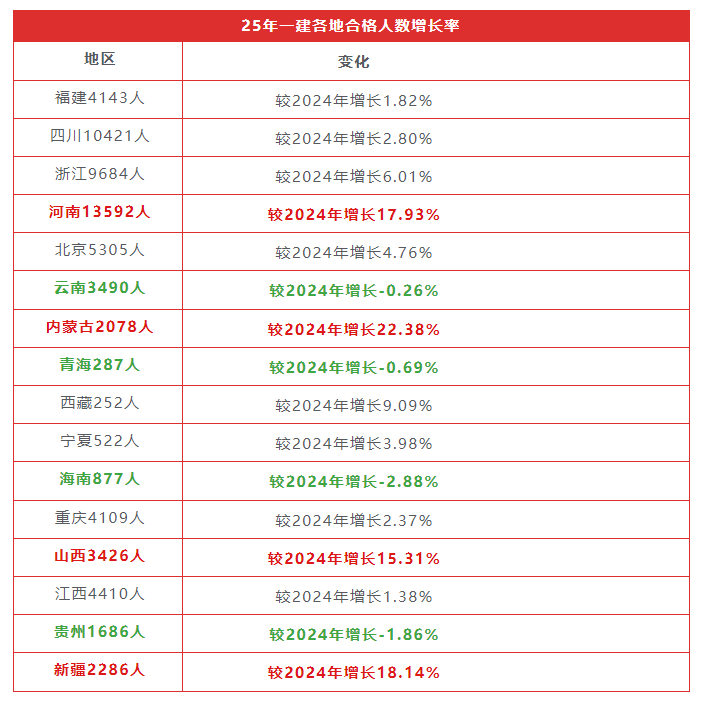 从数据中可以清晰的看到,一建合格人数整体上还是呈现出上升的趋势,仅有云南、青海、海南、贵州四个省份较24年的合格人数有所下降,其余全部上涨。