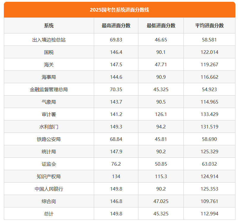 不同职位的进面分数线差异较大,受职位竞争程度、报考人数、地域等因素影响。热门职位或经济发达地区的进面分数线通常较高,而基层或偏远地区的分数线相对较低。考生可参考2025年国家公务员考试最低进面分数线,具体如下: