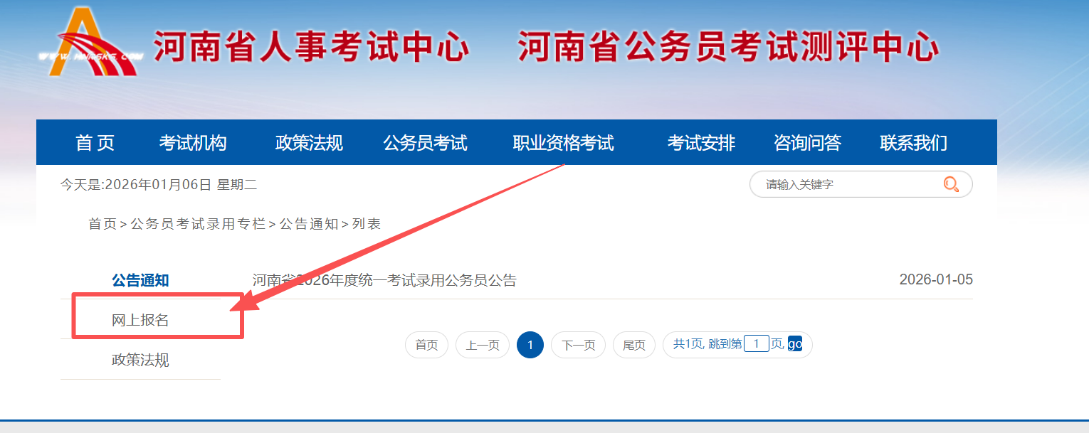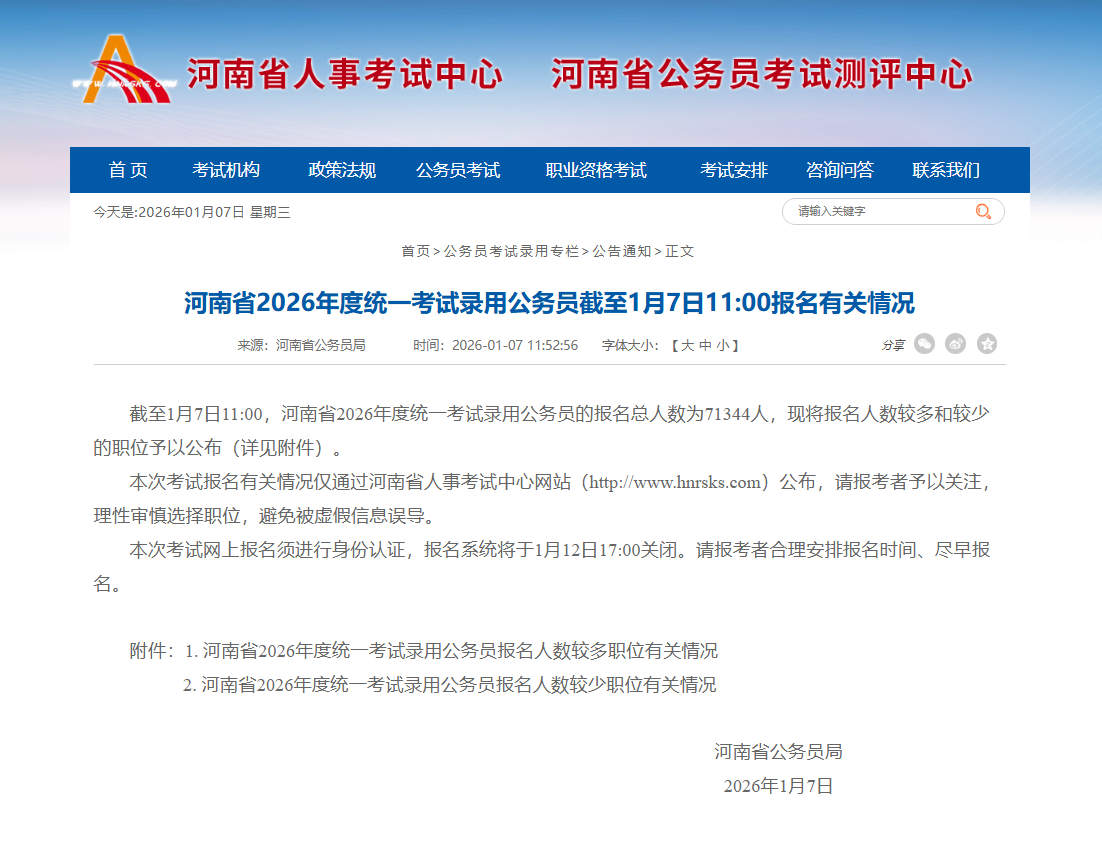 报名时间:2026年1月6日9:00至1月12日17:00 报名入口:河南省人事考试中心网站(http://www.hnrsks.com)“河南省2026年度统一考试录用公务员专栏”进入报名系统