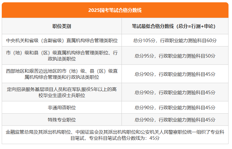 国考笔试成绩公布后,国家公务员局会划定合格分数线,同时公布进入面试环节的考生名单。考生可查看面试名单确认自己是否进面。国家公务员局会公布各职位进入面试人员中最后一名考生的笔试成绩,即该职位的最低进面分数。以2025年为例,笔试合格分数线如下: