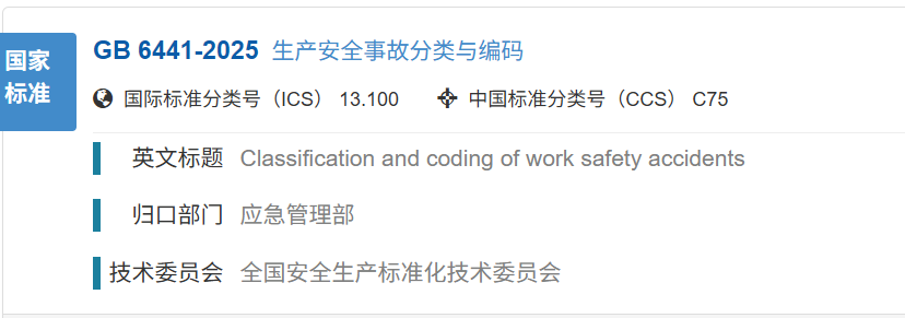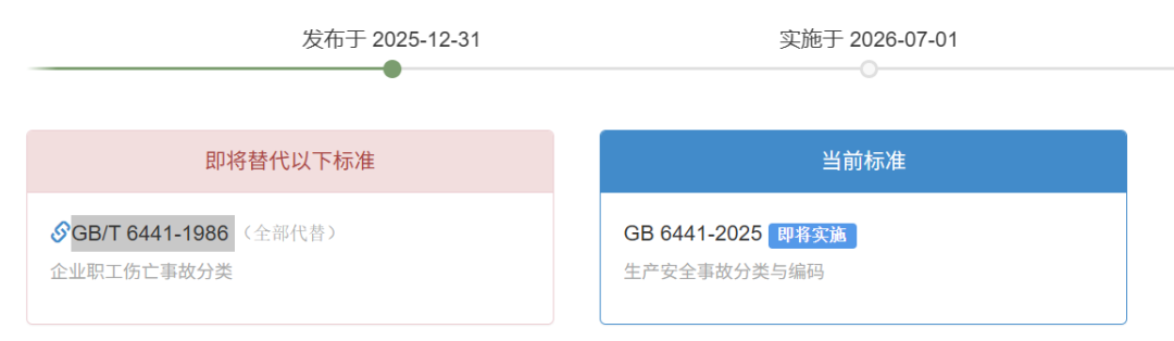 2025年12月31日,国家标准化信息服务平台终于官宣,新的“GB 6441-2025 生产安全事故分类与编码”正式发布,并将于2026年7月1日全部取代已经实行了近40年的“GB/T 6441-1986”。