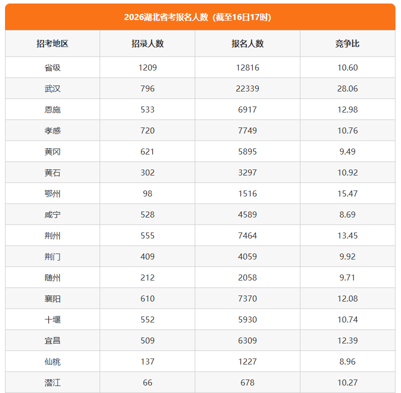 2026年湖北省考报名时间为1月13日-1月19日,今天是报名的第4天。截至1月16日17时,报名人数已达102352人,最高竞争比达401:1,还没报名的小伙伴们要抓紧时间。下面匠人教育就给大家详细介绍一下相关内容!
