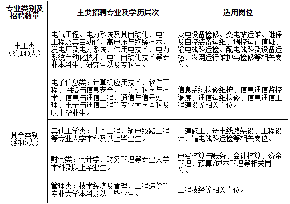 招聘专业指主修专业(不包含辅修专业)。招聘专业主要为电工类专业,少量招聘非电工类专业。根据2026年第一批招聘毕业生流失情况,进行少量补招。最终招聘数量将根据上级单位核定情况相应调整,主要招聘计划如下: