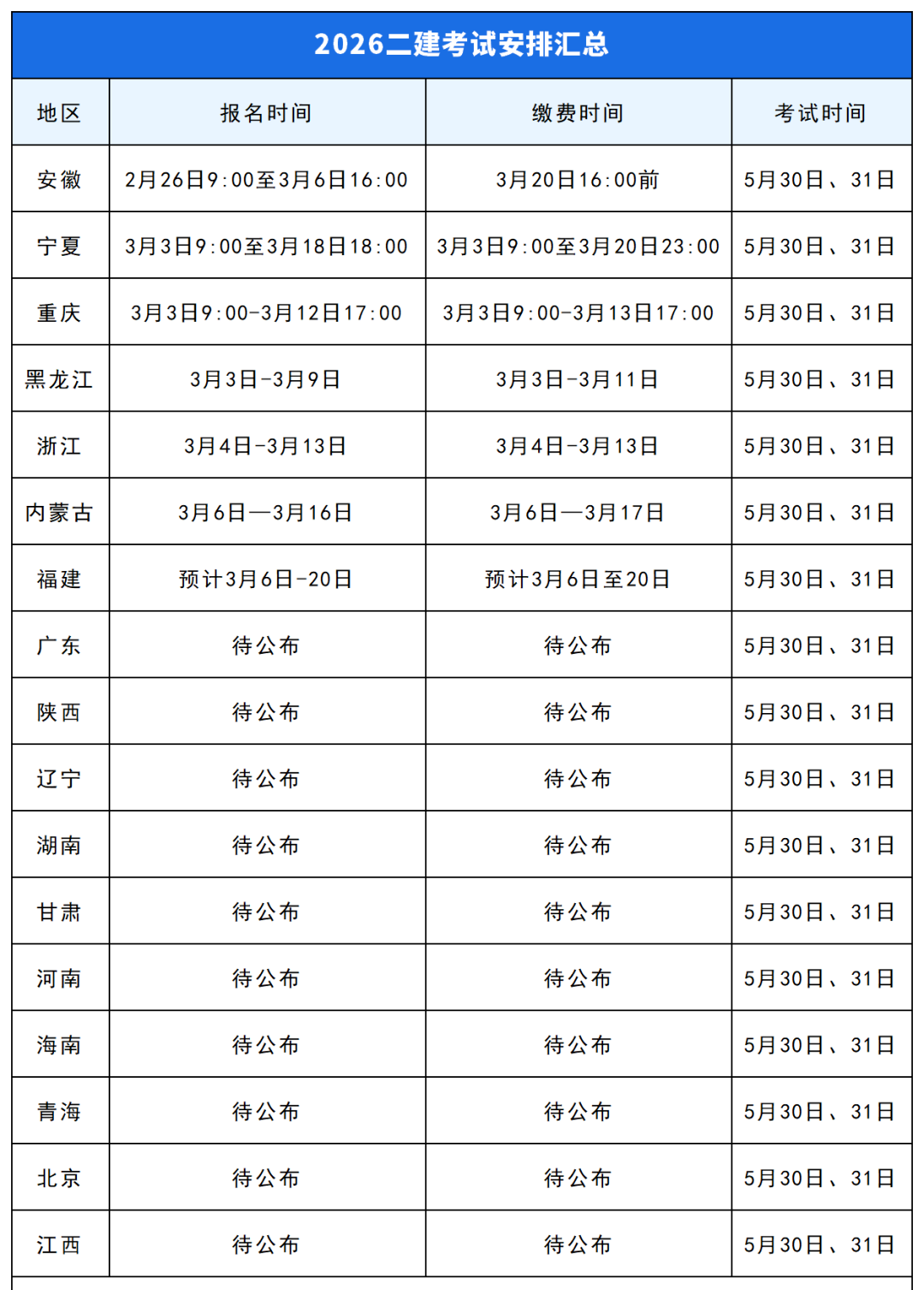 截至目前,已有17地公布二建考试时间,6地发布2026年二建报名通知: