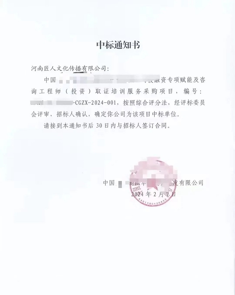 2月7日,匠人教育集团凭借强大的品牌影响力、优质的师资力量、完善的课程体系、创新的教学方法、多元的授课方式、成熟的技术平台等成功中标中国某集团有限公司专项培训及咨询工程师取证培训业务! 匠人教育集团始于2005年,是一家专业从事职业资格考前辅导培训、公务员考试培训、职业技能培训、企业培训与学历提升服务等于一体的综合性集团公司。在建造师、造价师、安全师、公务员等考试培训及企业培训方面处于行业领先地位。 在职业技能领域,匠人教育集团以“匠人工坊”与“河南建工职业技能培训学校”为依托,打造了智能制造PLC与机器人实训基地、河南省建设厅技术工人考试考核基地和建设领域关键人员岗位证考核基地。致力于服务产业转型升级、促进产教融合,并努力培育具备工匠精神和创新意识的“智造工匠”。技能人才就业率至今保持零差评,获得企业和学员的认可。 在企业培训领域,匠人教育集团以政策为指导,深刻把握市场方向,通过走访客户单位、开展需求调研,提供定制化培训方案创新教学方式,助力企业高质量发展!培训方向涵盖:新员工培训、专项培训,中高层管理培训,拓展培训等,培训课程及创新的全过程服务深受众中国建筑、中国中铁、中国化学、中国中治等数百家央企、国企、大中型企业的好评! 自主研发网校平台、小程序、APP“企教学堂”、“匠人网校”、“小啄刷题”等应用,拥有30余项软件著作,依托大数据、互联网、打造数智化教学平台:智能弹题、学习测评系统,智能数据大屏等有效的满足了学员及企业多元化学习及管理需求。 大咖云集,匠心育人。匠人教育汇聚985、211等国内知名院校师资及大型国企、央企、上市公司实战派讲师、教材编委、行业专家等,签约师资800余名!教研团队始终聚焦考试大纲、命题趋势、学员需求等,与时俱进,创新迭代教辅资料与教学服务,在行业内独创“六步通关教学法”、“企业落地全过程服务”、“项目管理沙盘”等极大提高了教学水平,使学习更容易落地,深受各界好评。 乘风破浪,载誉前行。凭借强大的品牌影响力、优质的师资力量、完善的课程体系、创新的教学方法、多元化的授课方式、成熟的技术平台等,赢得了广大企业与社会的广泛认可和赞誉。2012年被河南报业集团评选为“中原最具特色教育品牌”;2013年被大河网评选为“中原教育十大责任品牌”;2016年被新华网评选为“学员满意职业培训机构”;2020年获“AAA级”信用单位、2021年获“连锁加盟影响力品牌”“2021年度口碑影响力职业教育品牌”、2023年获“学雷锋爱心企业”“2023年度影响力公考教育品牌”等荣誉。目前已在全国22个省、4个直辖市、2个自治区设立服务网点达800余家。 职业教育与经济社会发展紧密相连,对促进就业创业、助力经济社会发展、增进人民福祉具有重要意义。集团将始终在职业教育培训领域精耕细作,充分发挥人才、资源等方面优势,持续为国内职业教育培训行业提供“匠人方案”,为推动职业教育的健康、可持续发展贡献自己的力量。